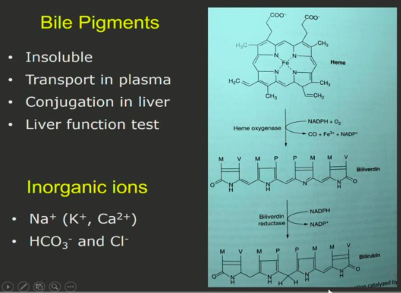 Mainly bile acids (and cholesterol and phospholipids), and electrolytes such as Ca2+, K+, Cl-, and Na+ in similar concentrations to plasma along with water.