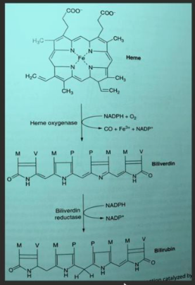 Heme oxygenase opens the structure and oxidizes it using NADPH to release CO and Fe2+ to form biliverdin, and then bilverdin reductase uses NADPH to form bilirubin
