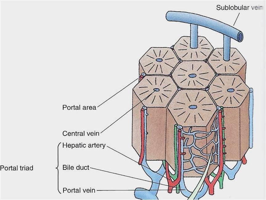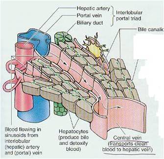 Hepatic vein (IVC, clean blood) anastomoses with hepatic artery (branch of celiac trunk) and portal vein (from digestive organs).