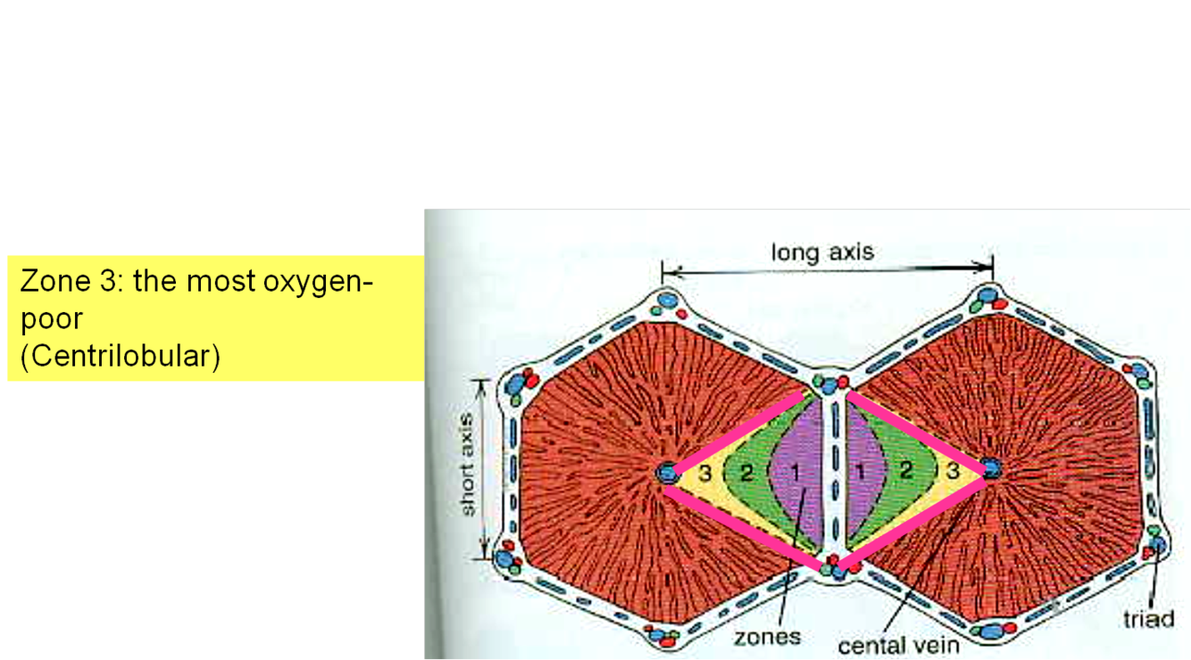Zone 3= most O2 poor, centrilobular *necrosis most common*