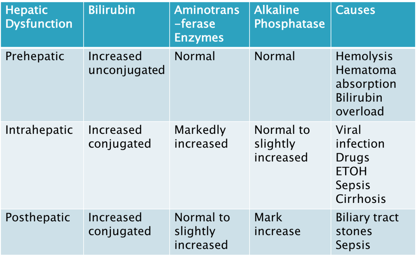 What lab differences would you see between prehepatic, intrahepatic, and posthepatic dysfunction? (chart)