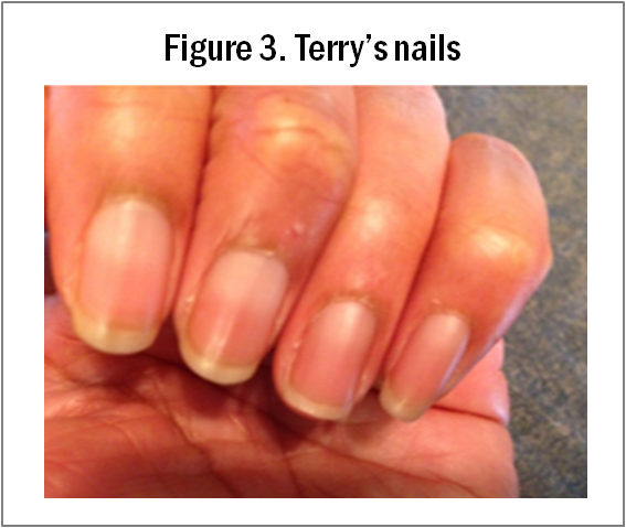 white proximally but distal 1⁄3 reddened by telangiectasia