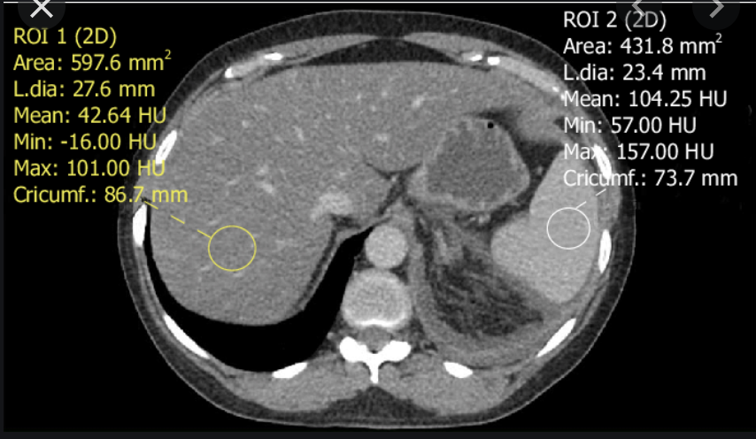 Ix: liver should be slightly hyperattenuating relative to spleen; normal liver 10HU < spleen.