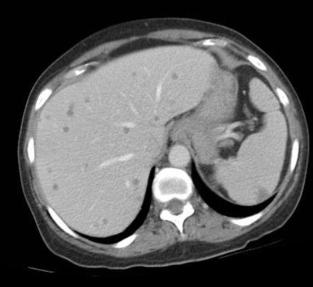 DDx multiple tiny hepatic hypoattenuating lesions