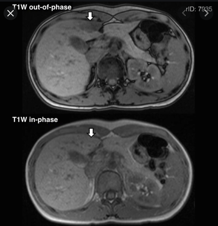 Ix: when water & fat protons are in the same MR voxel the fat/water signals are summed in in-phase, subtracted in out-of-phase.