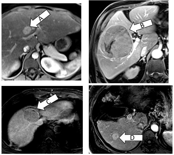 A isn’t great because it’s right up against the central structures with a fair chance of central biliary damage and long-term stricturing. B is too big. C is tucked against the cava-therefore due to heat sink issues, it would be hard or impossible to get all of the tumor. D is under 3cm, away from central structures. Surface/capsular tumors are doable but carry a higher risk of bleeding/seeding; the technical approach also has to be considered as to not burn body wall.