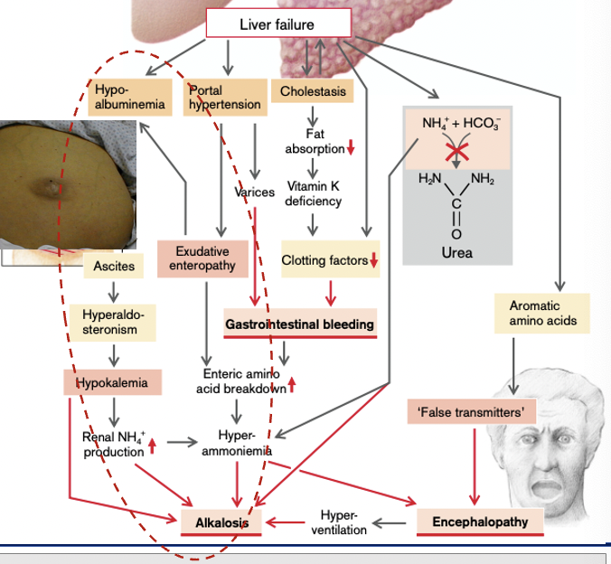→ alkalosis (hyperventilation and hyperammonemia, renal NH4+ increase, hypokalemia)
