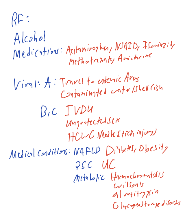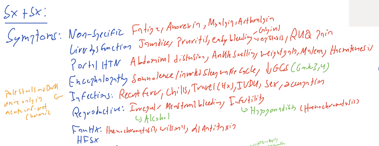List the symptoms/RFs you would like to ellict from a liver failure history.
