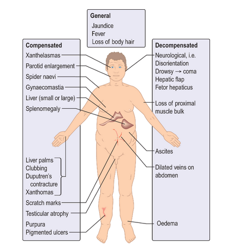 What are signs of decompensated chronic liver disease/acute liver failure?