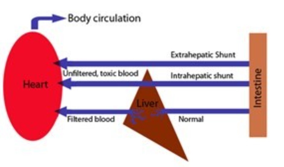 Encephalopathy - increased delivery of gut-derived products into the systemic circulation and brain from reduced extraction of nitrogenous products by liver and portal systemic shunting . Ammonia may play a part.