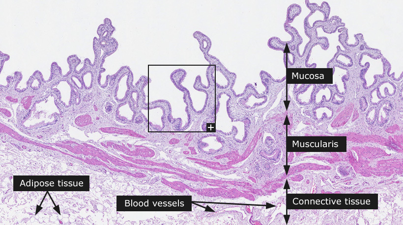 Has a mucosa, muscularis, and serosa/adventitia.