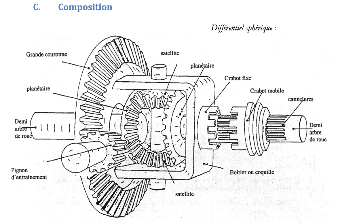 Le différentiel est un dispositif permettant à 2 arbres de tourner à des vitesses différentes.
