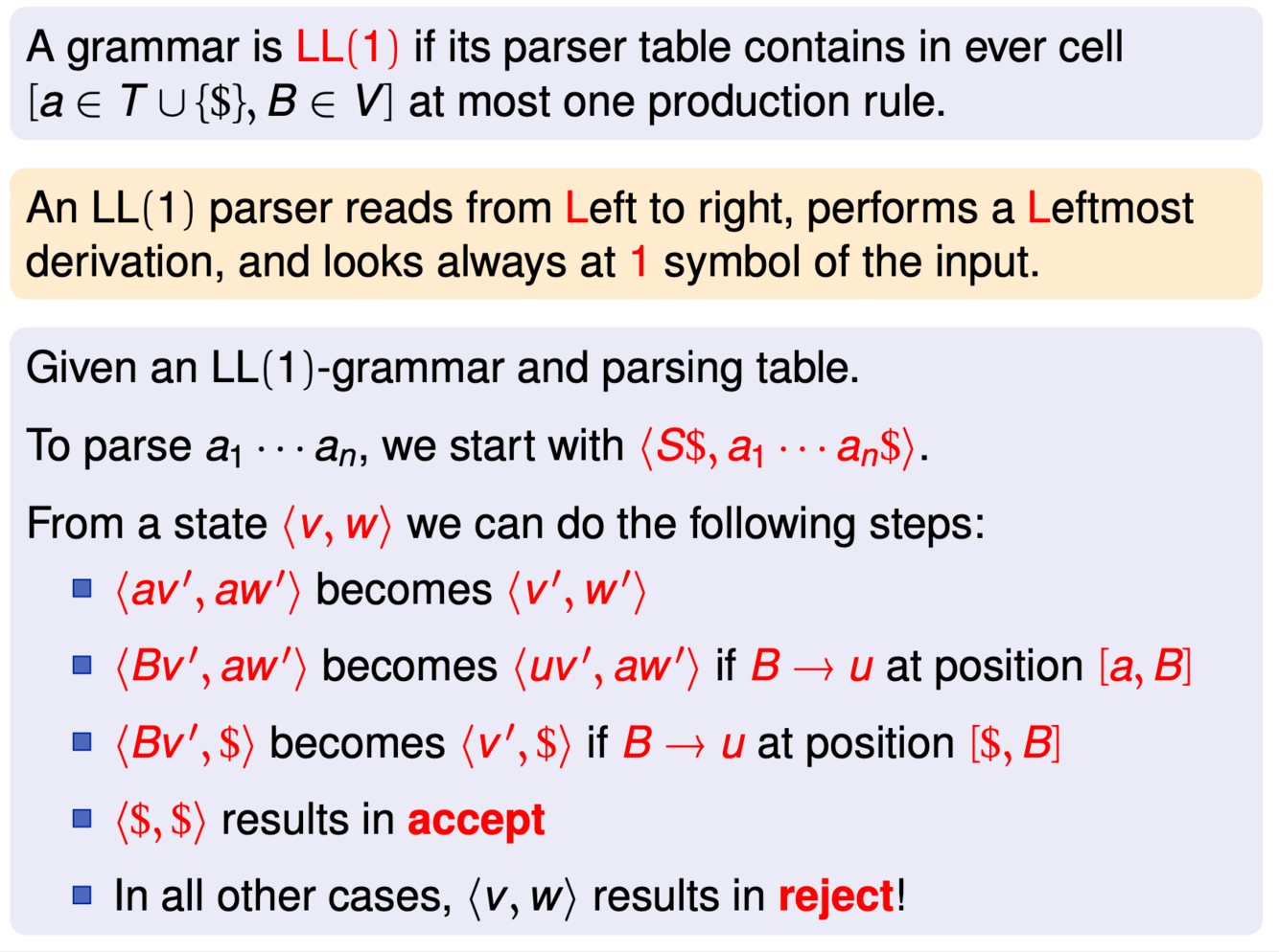 What are the steps of a LL(1) parser?