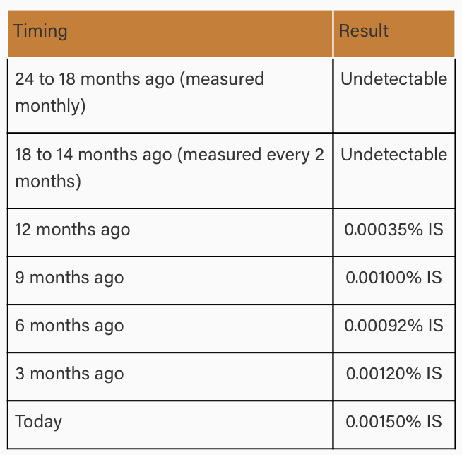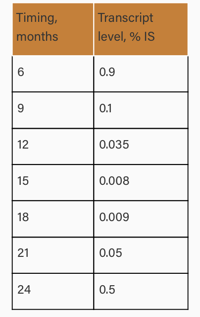 Embora os níveis de trasncritos estejam aumentando lentamente, eles permanecem abaixo de MMR 3 e atualmente permanece abaixo de MMR 4,5. O critério para reiniciar ITK pelo ultimo guideloine da ELN é aumentar o nível de transcrito para uma MMR 3.0.