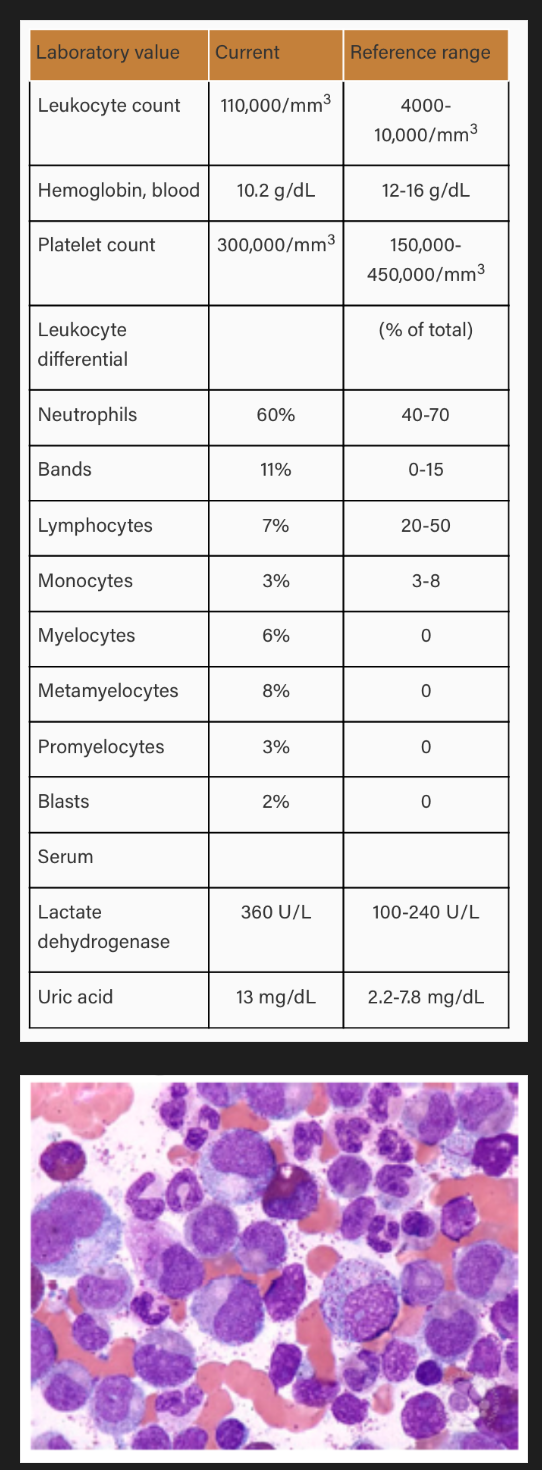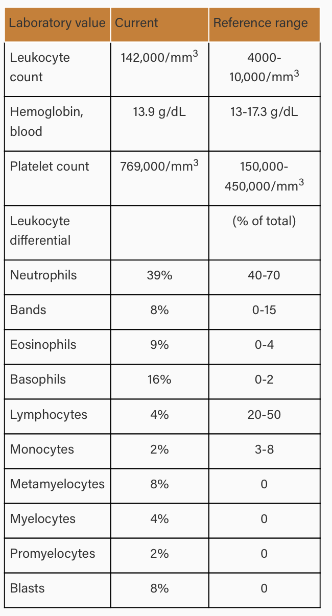 Um homem de 50 anos é encaminhado para avaliação por causa de historia de sudorese noturna e saciedade precoce há 3 meses. Ao exame fisico, a ponta do baco é palpável a 10cm do rebordo costal. Os exames são o seguinte;