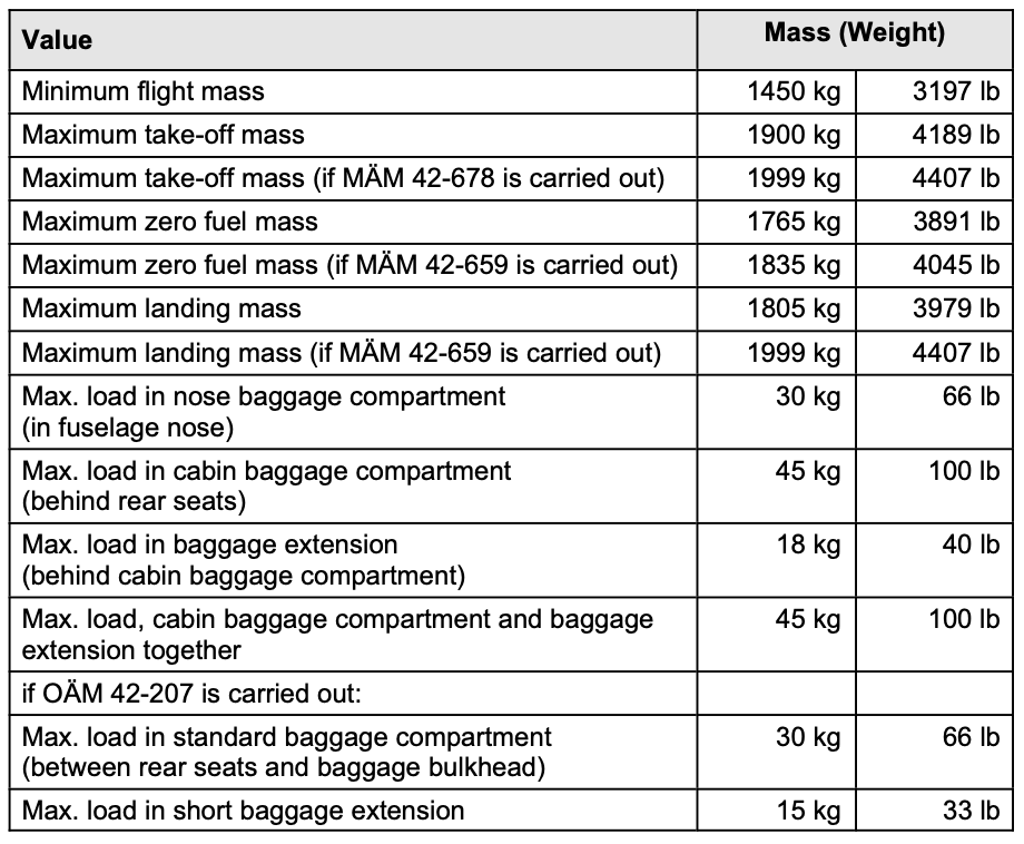 Max. load, cabin baggage compartment and baggage