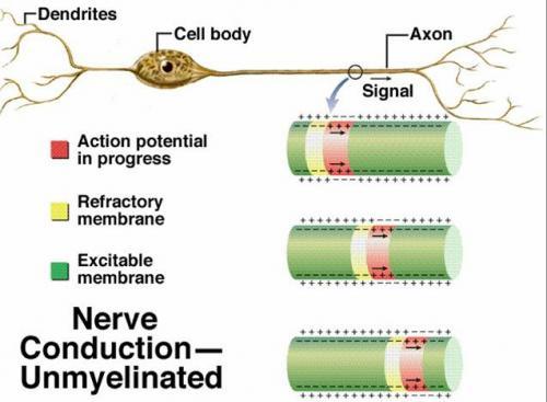 by an action potential “wave of depolarization” that is propagated along the axon by continuous coupling between excited and non-excited regions of the membrane.