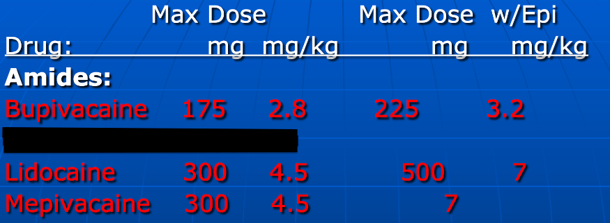 What is the maximum dose of local anesthetics a patient should receive? (specificially the ones in red from the ppt slides)