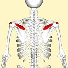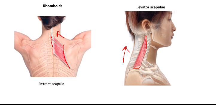 medial aspect of scapula to upper thoracic vertebra. muscle fibres cause retraction of scapula