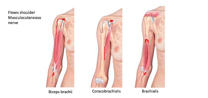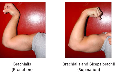 supinated forarm - brachiali and bicep brachii flex elbow joints