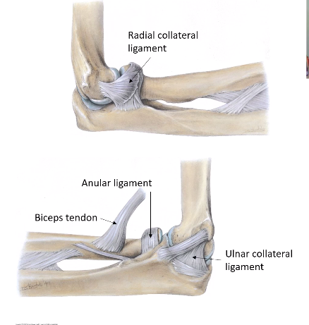 which ligaments do we find around elbow joint [3] what do they help cause movement of ? [3]