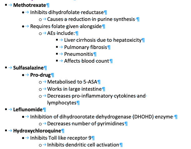 Explain MoA of conventional synthetic DMARDs? [4]