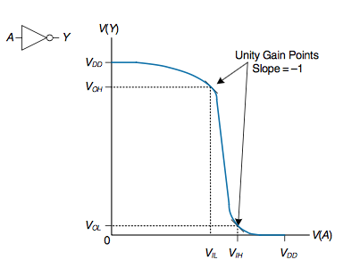Points on a transfer characteristic graph (input against output voltage) where the gradient is -1