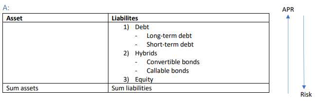 The different components of the firm’s capital structure is organized after the Absolute Priority Rule (APR), where the seniority on the firms cashflow increased the higher in the balance sheet the instrument is. Thus, debt instruments have seniority over both hybrids and equity, and ling-term debt have seniority over short-term debt. AS the seniority decrease the risk increased. Equity have therefore more risk than debt.