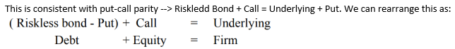 If V >= D, then the firm is solvent and the creditors receive D. If V < D, then bankruptcy occurs and the creditors receive V. So at maturity creditors recieve: min(D,V) = D - max(0,D-V) –> risky corporate debt is equivalent to a portfolio of riskless debt plus a written put!!