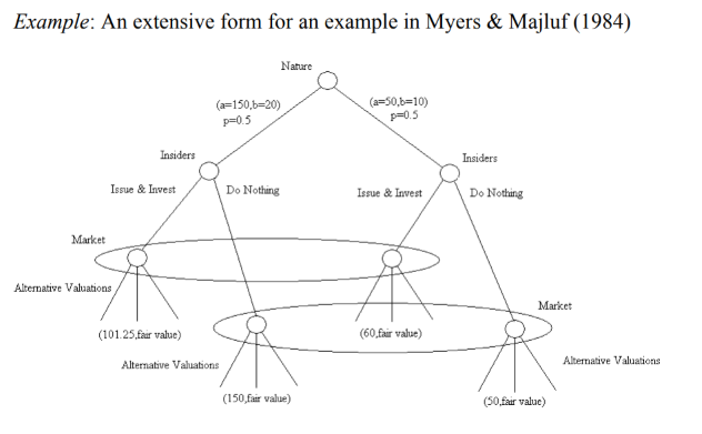 The market value will generally not equal actual value, as market only know A and B dsitribution. But market draws inferences about the realization og a and b form firms actions. Logic: