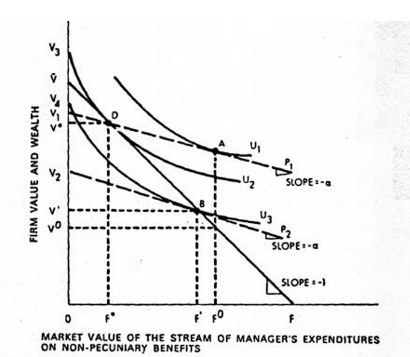 When the manager of the firm owns 100% of the equity, the value of the firm and the level of perks is given by point D. Where the indifference curve of the manager U2 is tangent with the managers budget constraint (slope of -1), giving V* and F* respectively. However if the manager sells a share of the firm (1- ∝), and retain share ∝ for himself his incentive to consume perks increases.