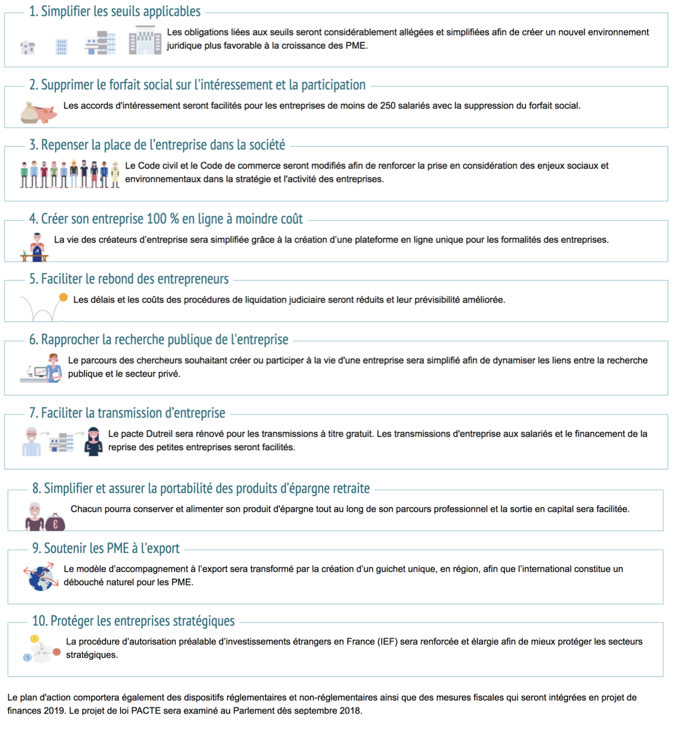 La loi PACTE comporte au total 70 articles. Parmi ces mesures, dix d’entre elles sont particulièrement emblématiques et démontrent la volonté de mieux financer les entreprises et de les rendre plus justes, plus libres et plus innovantes.