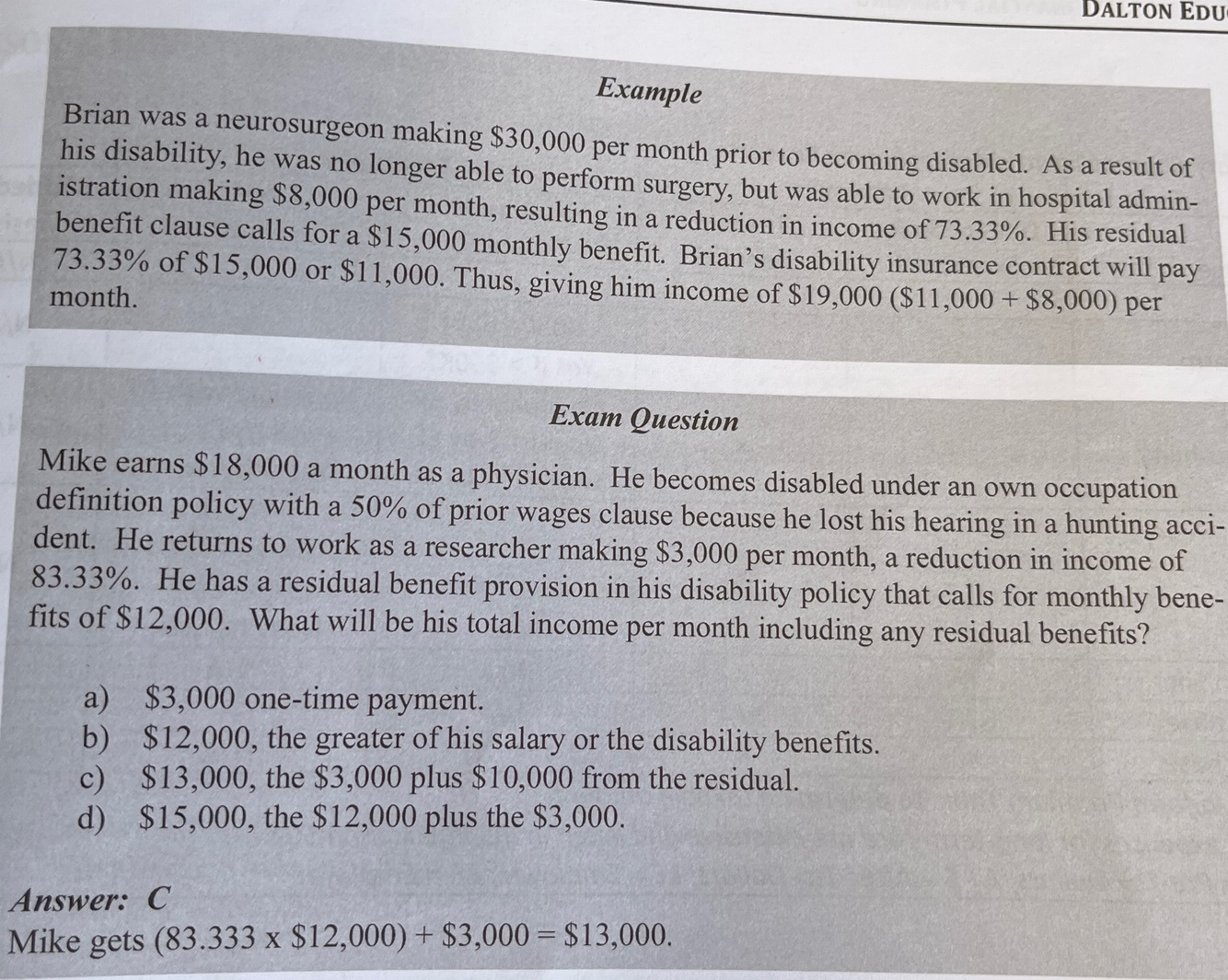 If insured goes back to work at less pay, the policy will pay the difference between current income and income prior to disability.