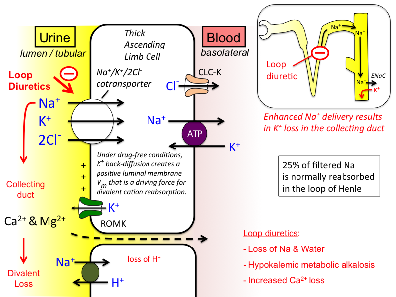 Act principally on the ascending limb of the loop of Henle, where they inhibit the Na+/K+/2Cl−co-transporter. This causes potent diuresis. In addition, loop diuretics have a direct effect on blood vessels, causing dilatation of capacitance veins.