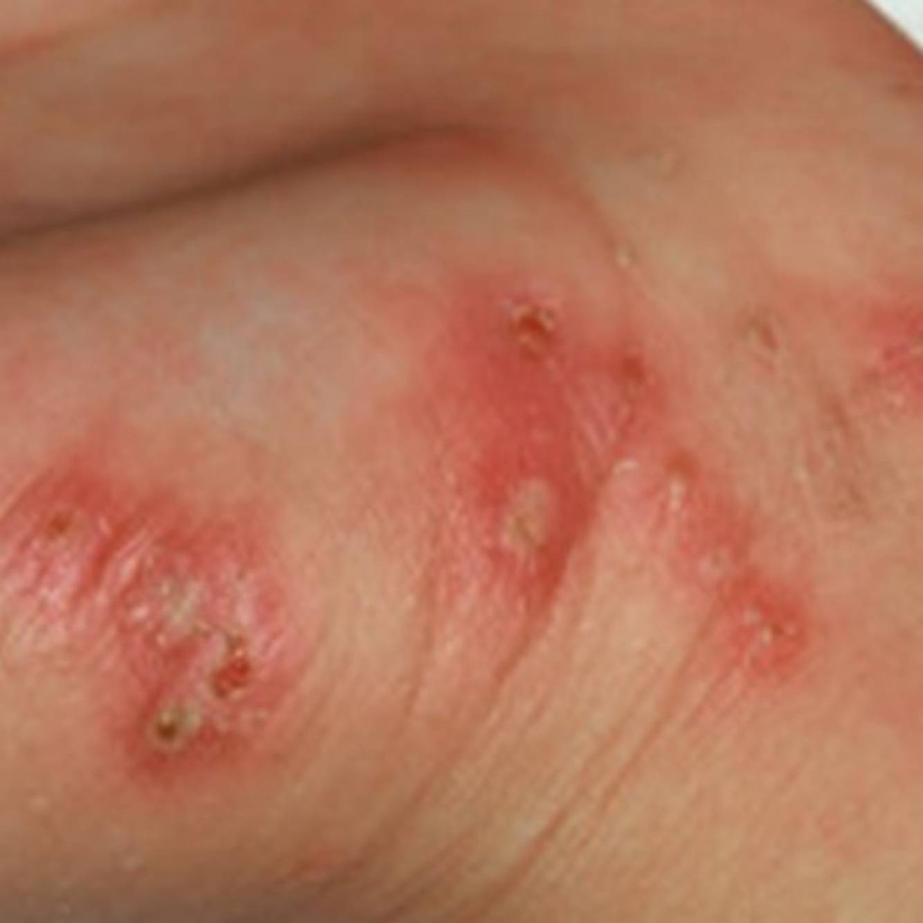 -Red spots with silvery interlinking lines - usually in webbing of fingers/toes