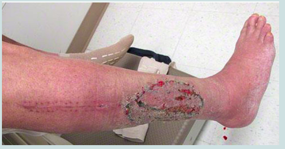 The patient described has signs and symptoms of a venous stasis ulcer, a common cause of chronic lower leg wounds. Venous valve incompetence leads to chronic venous hypertension, capillary hydrostatic pressure elevation, and leakage of fluid and proteins to the extracellular space. Oxygen transport to the tissues is impaired, causing localized cellular necrosis and ulceration.