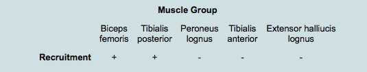 The most likely site of injury would be the common peroneal nerve at the knee. Injuries to the common peroneal nerve are well documented in both traumatic (knee dislocation) and iatrogenic settings. Patients have footdrop and numbness over the first dorsal web space of the foot. History and clinical examination are the mainstays for diagnosis, but electromyography can be helpful in less-clear circumstances. The absence of recruitment of the lateral compartment muscles (peroneals) and the anterior compartment muscles (tibialis anterior, extensor hallucis longus) strongly suggest common peroneal involvement. The presence of recruitment of the biceps femoris and the tibialis posterior rules out tibial nerve involvement. An isolated superficial peroneal nerve injury would spare the anterior compartment muscles.