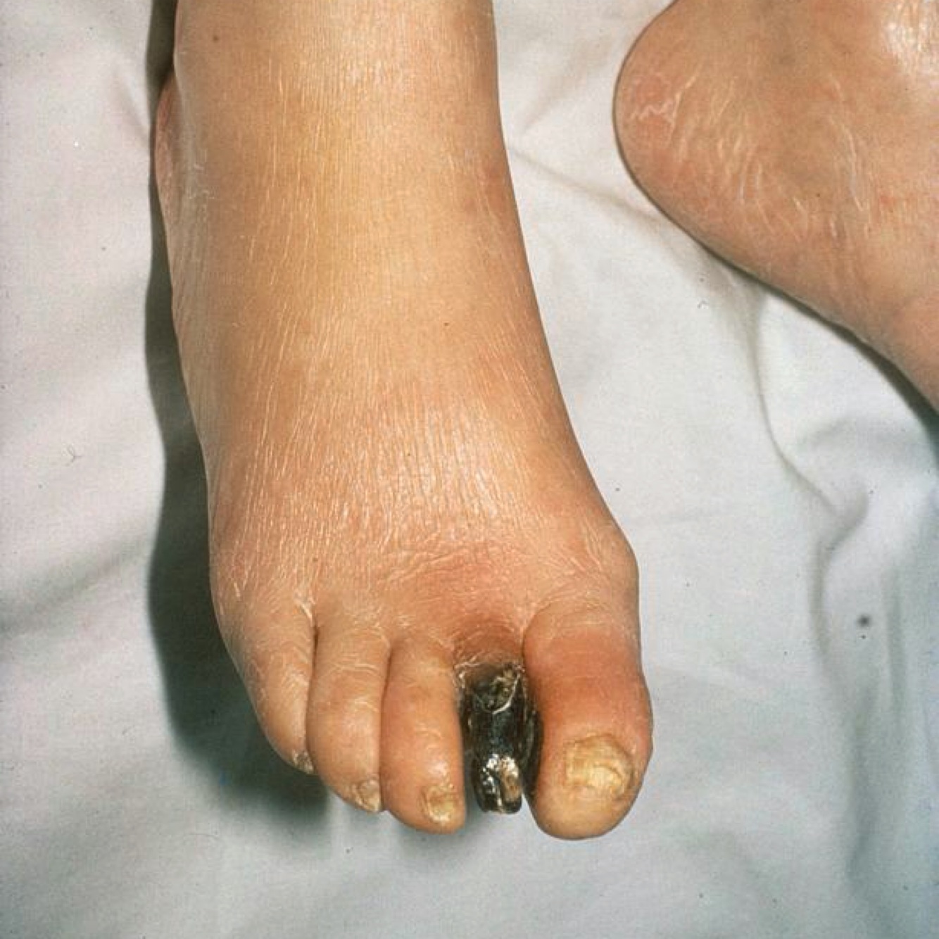 Amputation is indicated in this patient who has obvious necrosis of the toe. Indeed, ischemic changes and wound problems are often seen in patients with diabetes mellitus. Because these patients are typically predisposed to further, more proximal amputations in the future, a conservative approach to amputation should be used in this instance. Several factors, including ankle-brachial index, help to predict the success rate in patients who undergo partial amputations of the foot; an ankle-brachial index of less than 0.7 indicates a markedly increased risk for wound healing problems following surgery. However, this patient has an ankle-brachial index of 0.76, which is an acceptable risk for complications following amputation. Therefore, an evaluation for the likelihood of revascularization should be undertaken prior to any amputation procedure. The surgeon should attempt to save as much of the foot as possible to allow for primary closure of the defect. As a result, the amputation should be performed at the metatarsal level in this patient. The surgeon should also be aware of the vascular supply to the adjacent toes during the amputation procedure in order to prevent any associated complications.