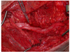 The patient has a major vascular injury that is greater than 5.5 cm in length. A shark bite is considered contaminated and requires debridement. Because of the length of arterial injury, vein grafting is the most appropriate management option. End-to-end and end-to-side anastomoses are incorrect because the arterial defect is too long. The use of prosthetic material is incorrect because this is a contaminated wound, increasing the risk for infection.