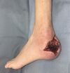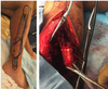 E) Serial debridement of the wound and coverage with a gastrocnemius muscle flap