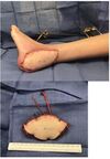 The medial plantar artery flap is elevated starting at the plantar aspect, deep to the muscular fascia. The perforator is identified between the flexor hallucis and abductor hallucis muscles. The perforator is then dissected toward its origin on the medial plantar artery in the intermuscular space.