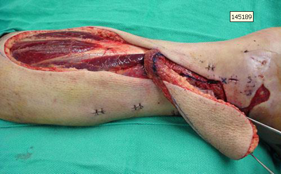 The gastrocnemius flap is the primary flap used to cover soft-tissue defects of the upper third of the tibia and knee. The gastrocnemius muscle is a bipennate muscle located on the posterior surface of the lower leg. The muscle originates from the medial and lateral condyles of the femur and inserts into the Achilles tendon. The dominant blood supply of the muscle is the medial and lateral sural arteries, which are branches of the popliteal artery. Generally only one head of the gastrocnemius flap is harvested to cover soft-tissue defects. The muscle alone is generally taken and is covered with a split-thickness skin graft for lower extremity reconstructions. The geniculate arteries primarily supply the bone around the knee joint.