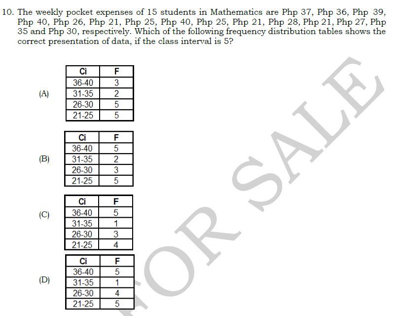 The weekly pocket expenses of 15 students in Mathematics are Php 37, Php 36, Php 39, Php 40, Php 26, Php 21, Php 25, Php 40, Php 25, Php 21, Php 28, Php 21, Php 27, Php 35 and Php 30, respectively. Which of the following frequency distribution tables shows the correct presentation of data, if the class interval is 5?