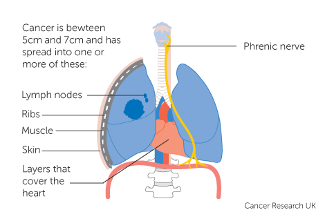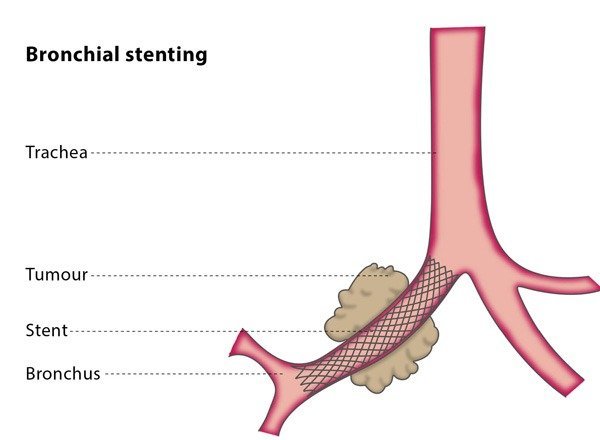 endobronchial treatment with stents or debulking to relieve bronchial obstruction caused by the cancer