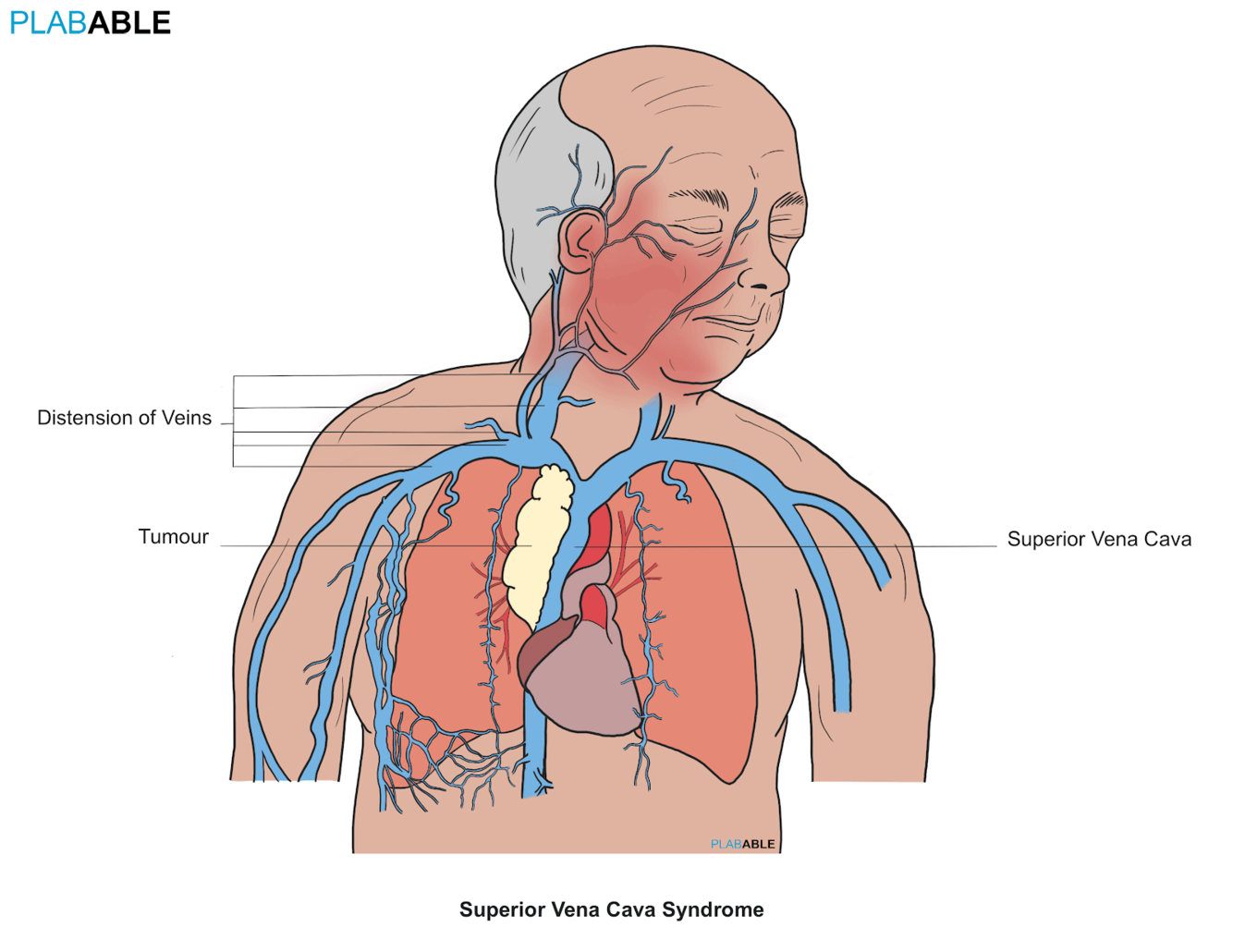presents with facial swelling, difficulty breathing and distended veins in the neck and upper chest