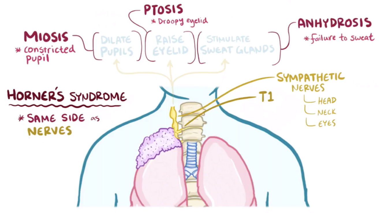 caused by pancoast’s tumour in the pulmonary apex pressing on the sympathetic ganglion