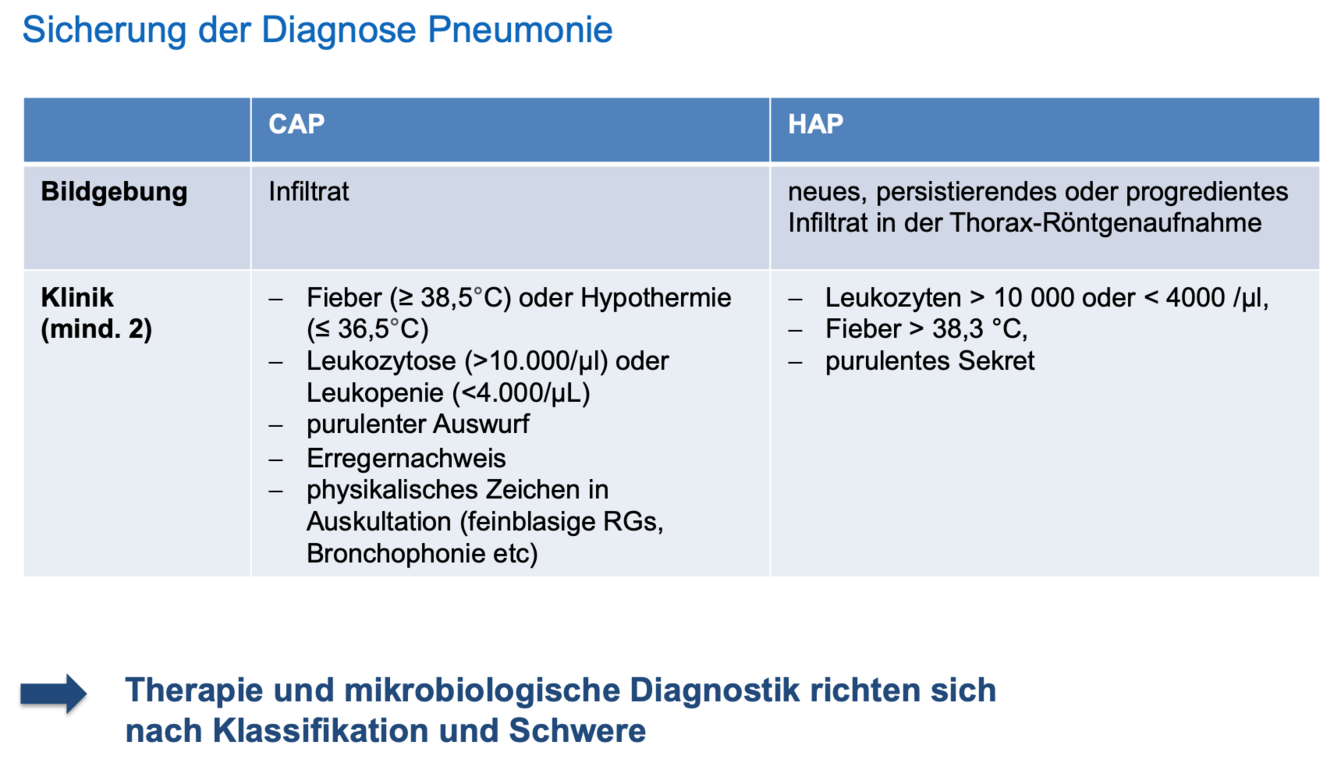 Diagnose Hauptkriterium (Infiltrat im Röntgen in 2 Ebenen) +2 klinische Kriterien