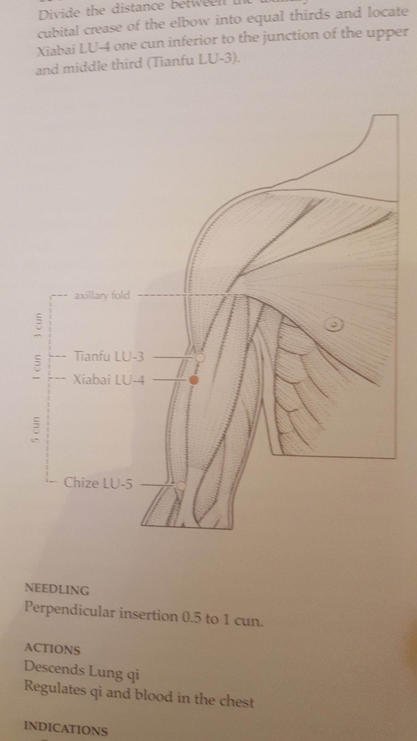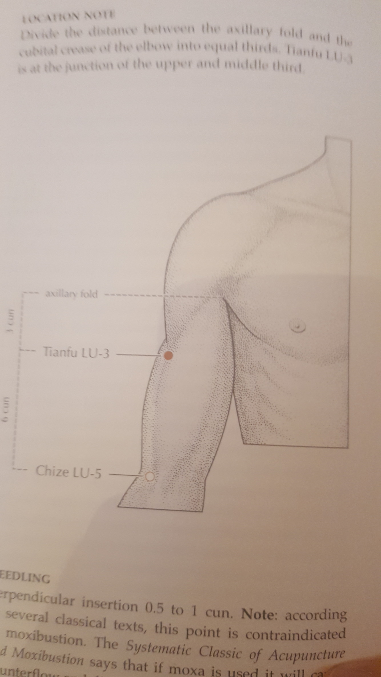 Pinch up the skin over the point, needle transversaly in a proximal or distal direction, 0,5 to 1 cun, avoiding the cephalic vein