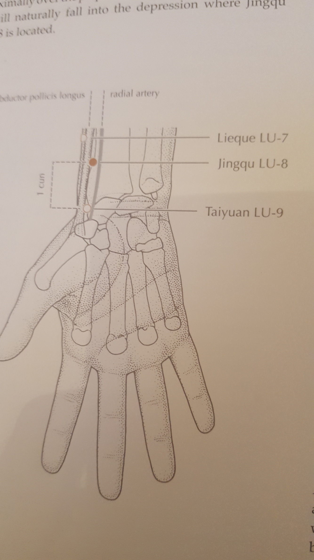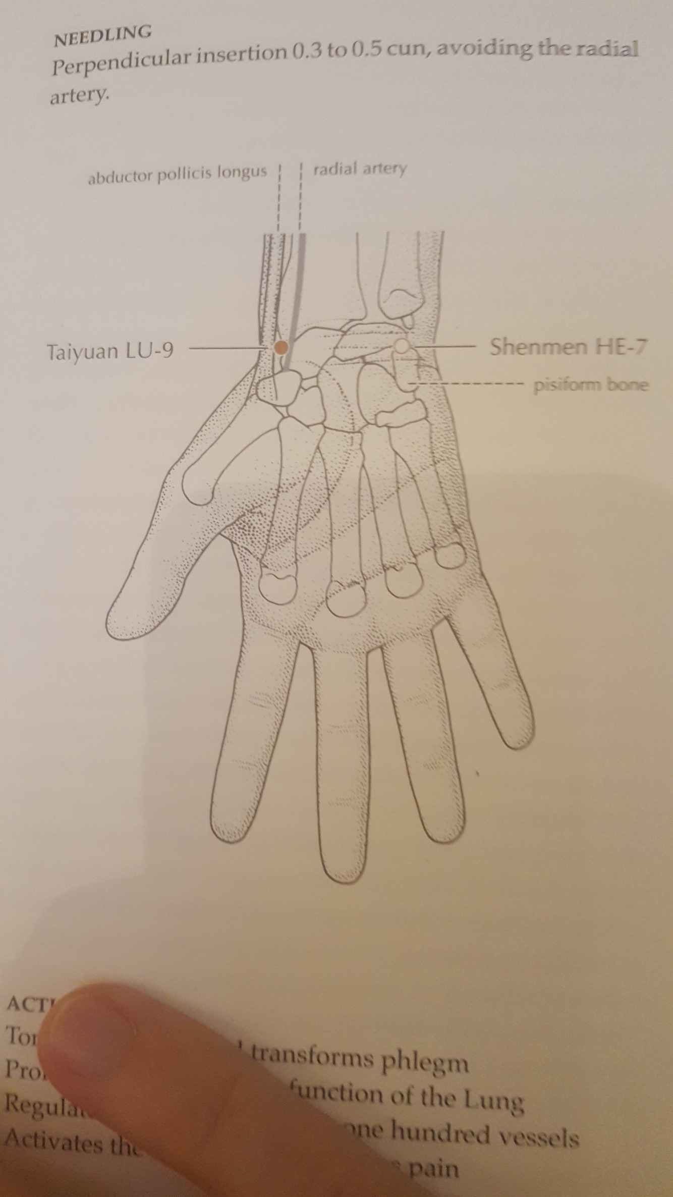 Perpendicular 0,3-0,5 cun avoiding the radial artery