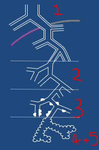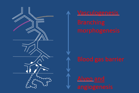 Endothelial cells differentiate in mesenchyme due to production of vascular EGF at the tip of the lung bud. Endothelial cells coalesce (come together) to form capillaries in a process called VASCULOGENESIS, with airways acting as a structural template. ***This means that VASCULOGENESIS IS MATCHED BY BRANCHING MORPHOGENESIS!!!